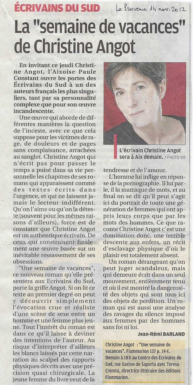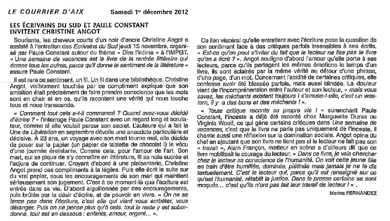 - 18 décembre. Entretien de Gilles Lapouge avec Paule Constant. Amphithéâtre Zyromski, 23 rue Gaston de Saporta.