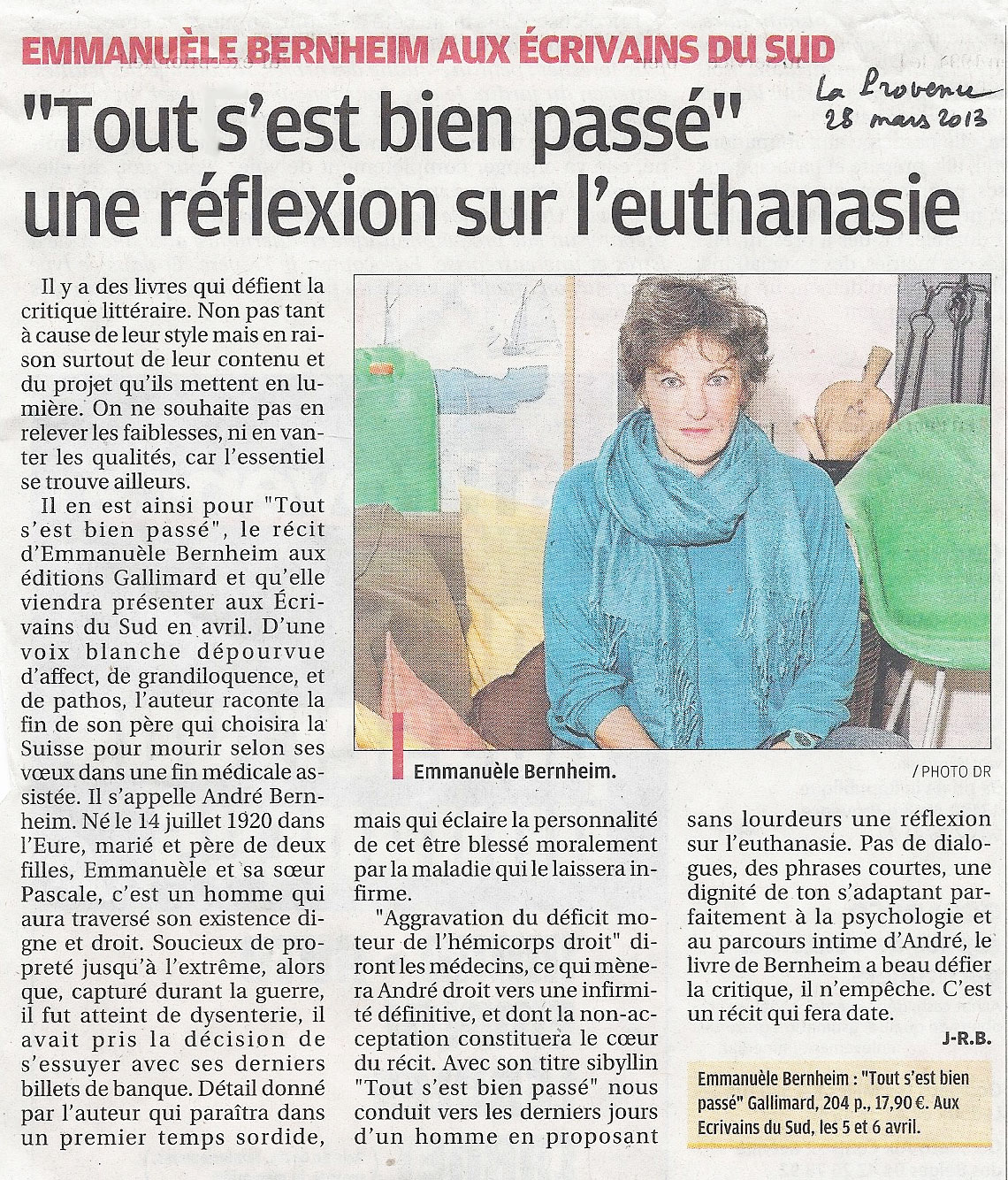 "Tout s'est bien passé", une réflexion sur l'euthanasie, Jean-Rémi Barland, La Provence, 28 mars 2013