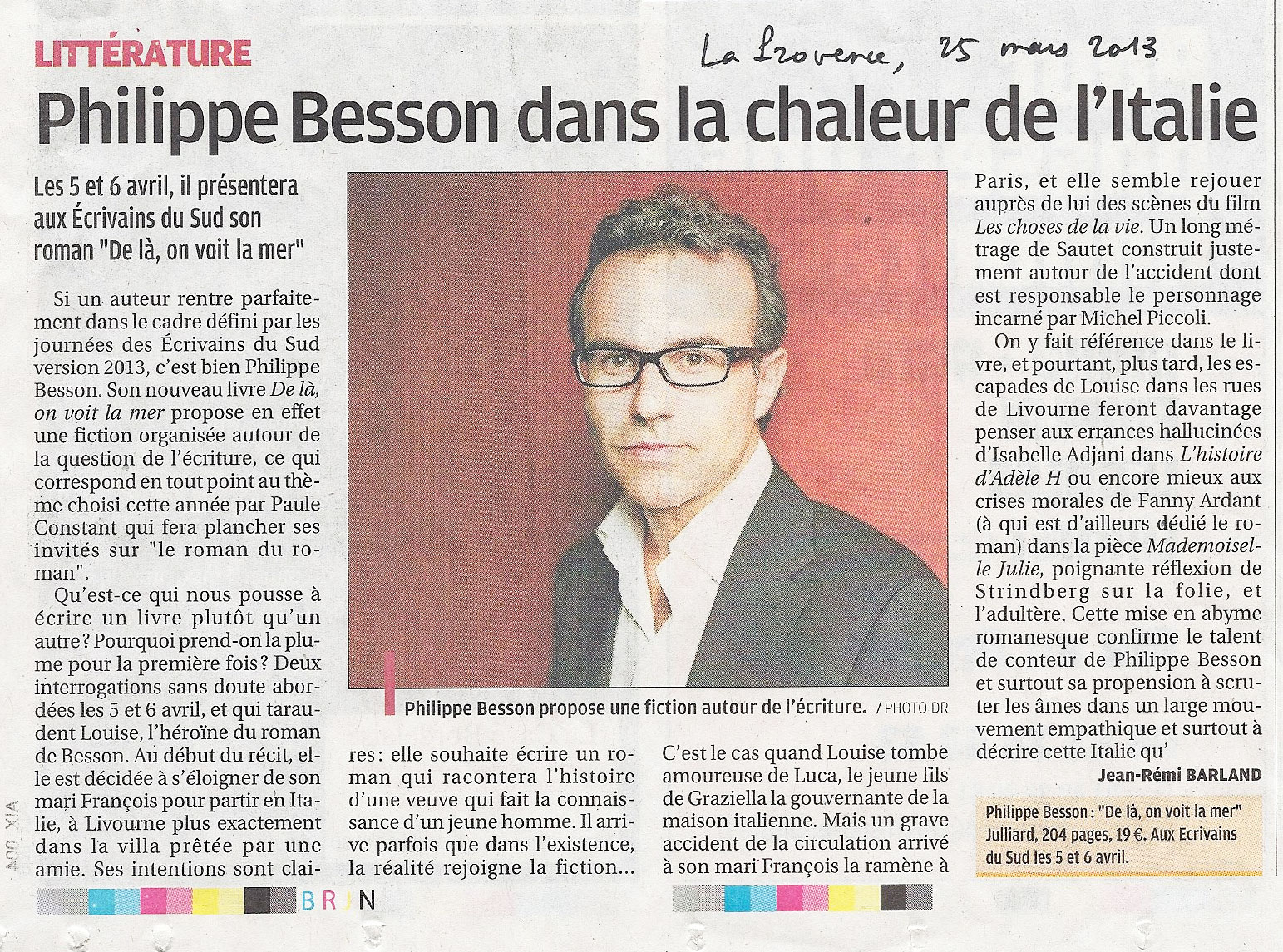 Philippe Besson dans la chaleur de l'Italie, Jean-Rémi Barland, La Provence, 25 mars 2013
