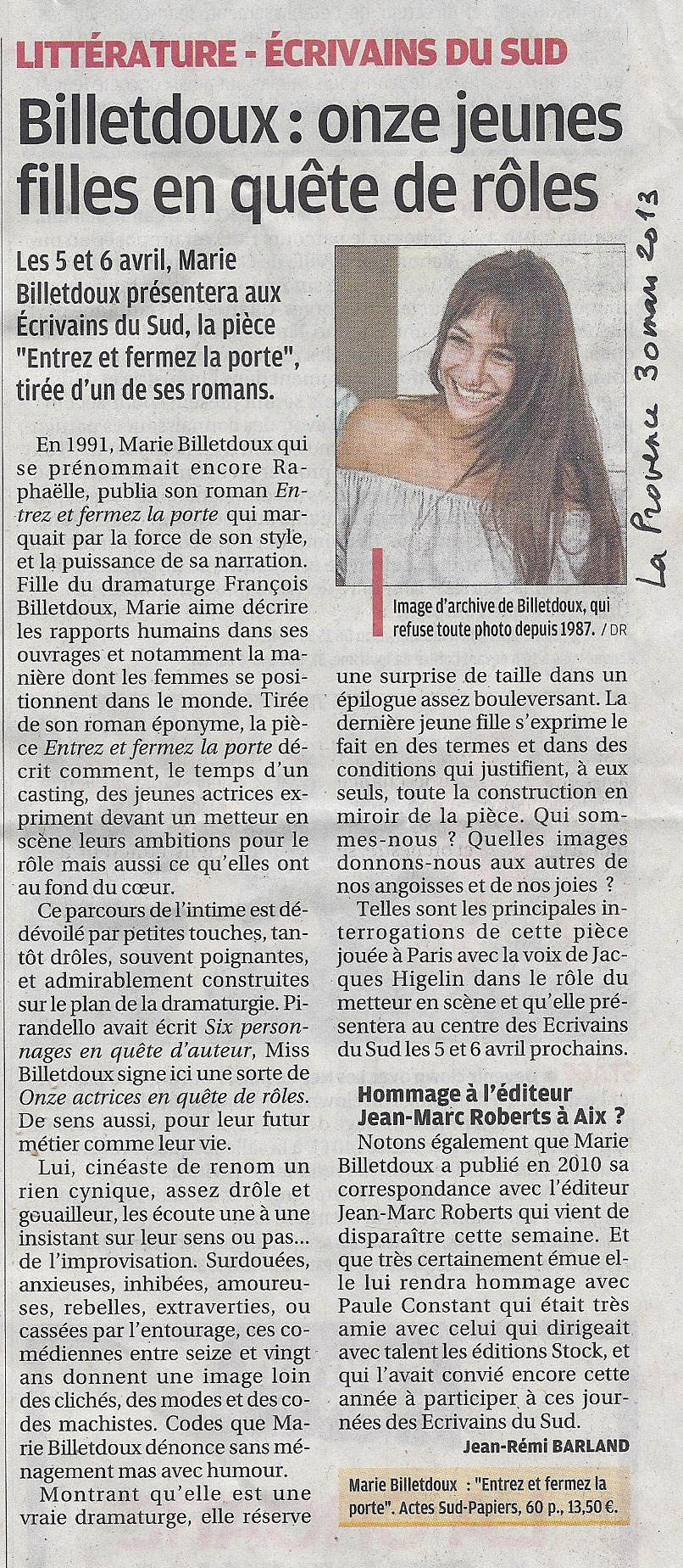 Billetdoux : onze jeunes files en quête de rôles, Jean-Rémi Barland, La Provence, 30 mars 2013