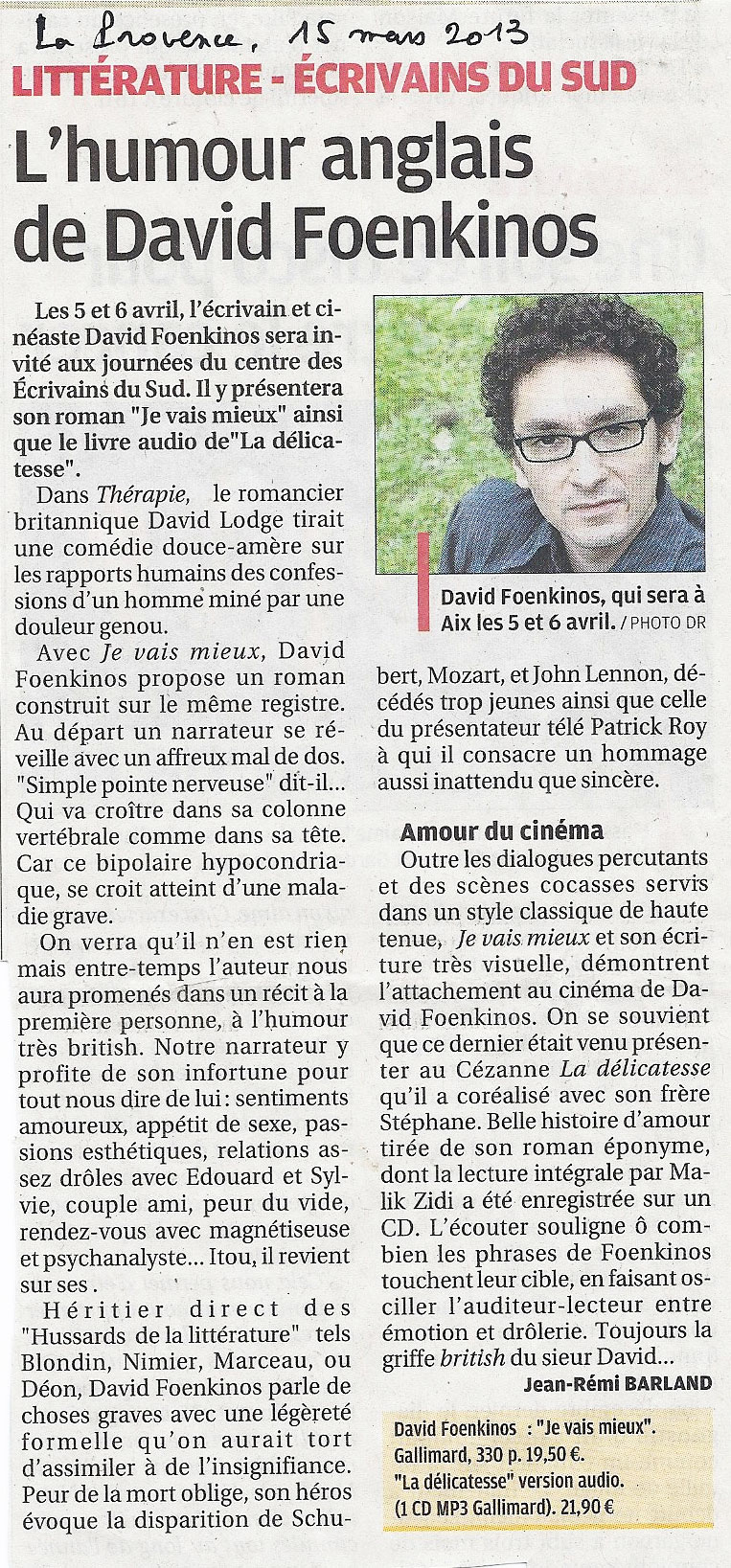 L'humour anglais de David Foenkinos, La Provence, 15 mars 2013