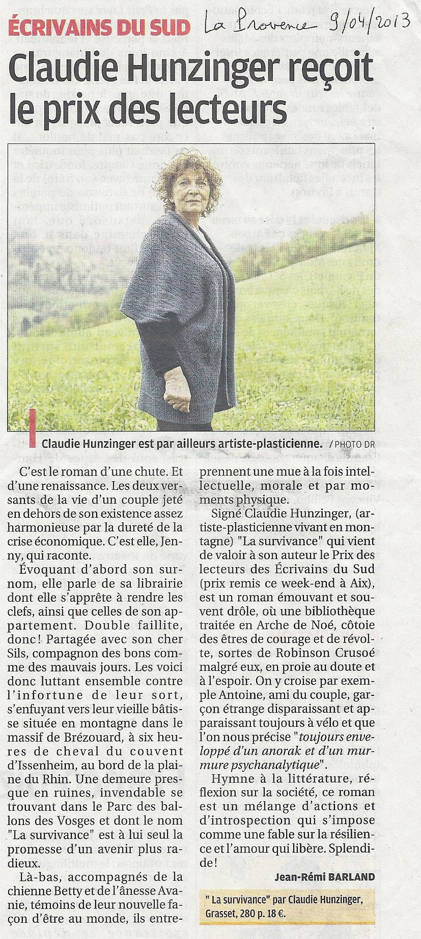 Claudie Hunzinger reçoit le prix des lecteurs, Jean-Rémi Barland, La Provence, 9 avril 2013