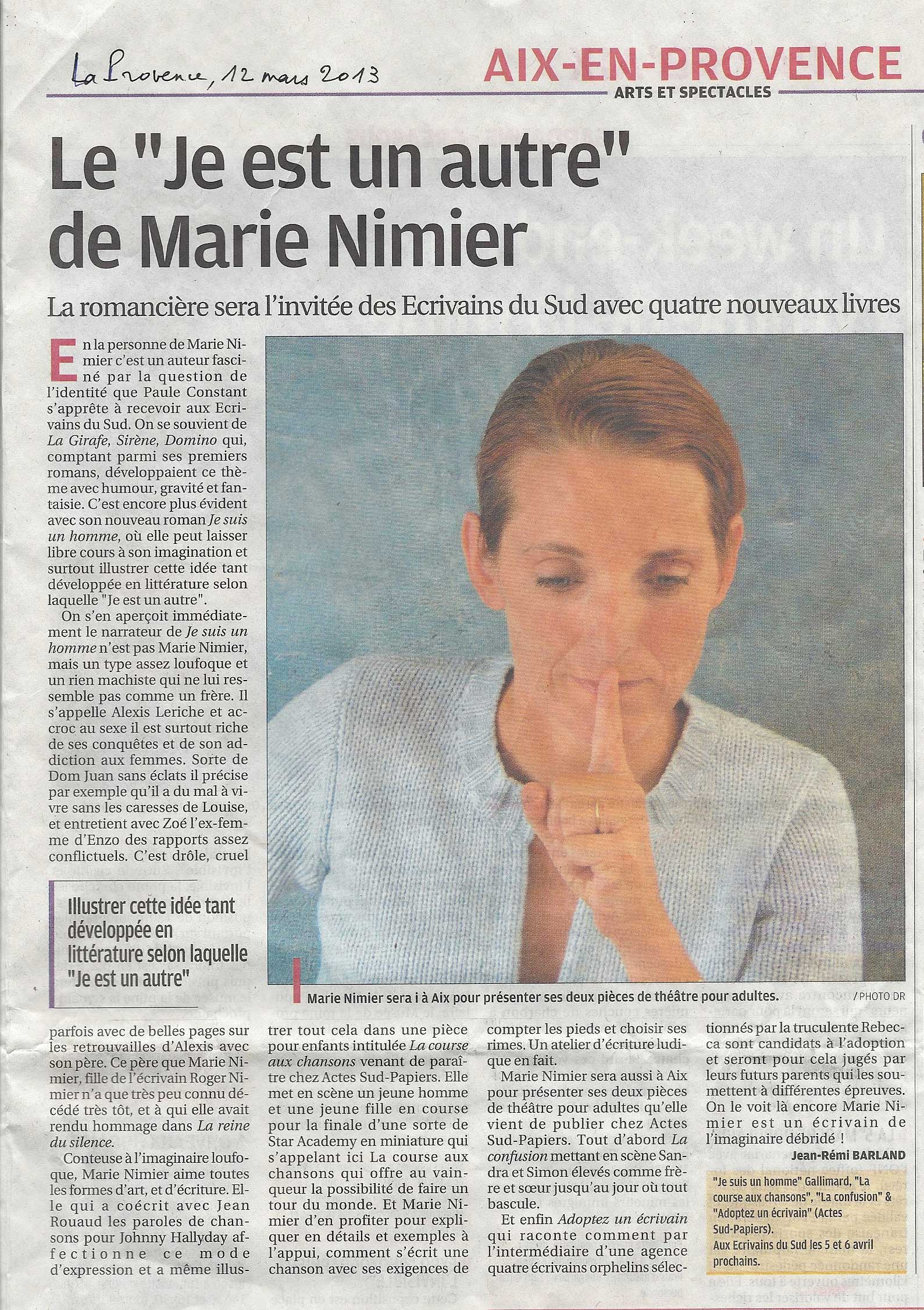 Le "Je est un autre" de Marie Nimier, Jean-Rémi Barland, La Provence, 12 mars 2013