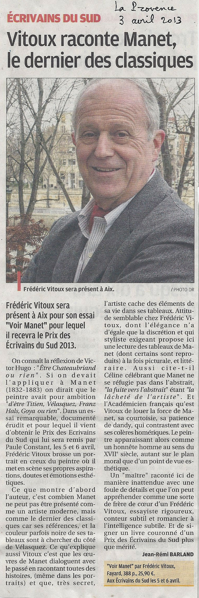 Vitoux raconte Manet, le dernier des classiques, Jean-Rémi Barland, La Provence, 3 avril 2013