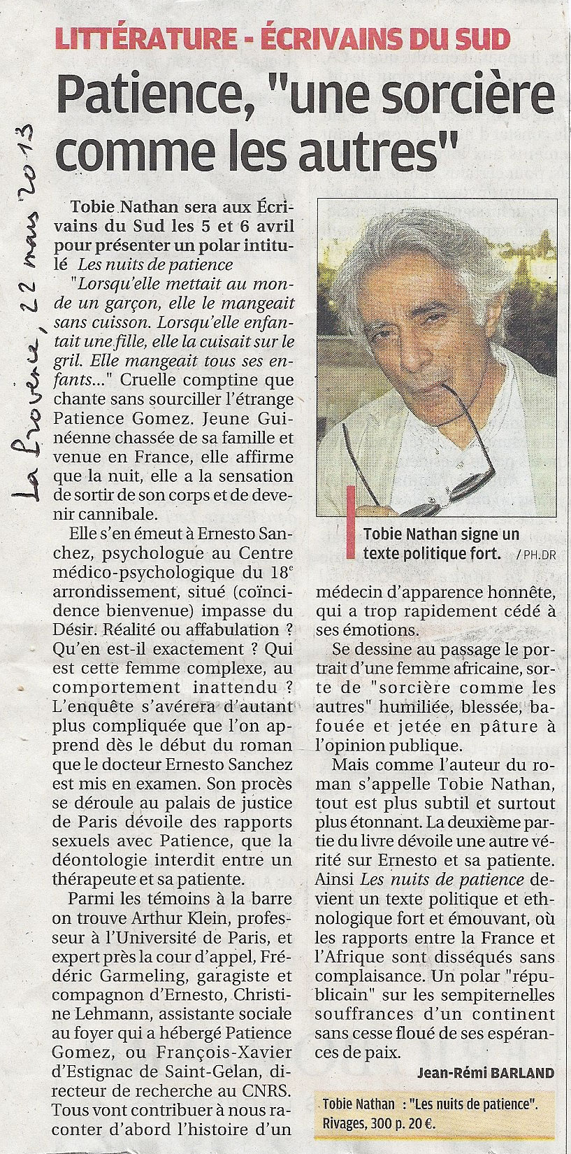 Patience , une sorcière comme les autres, Jean-Rémi Barland, La Provence, 22 mars 2013